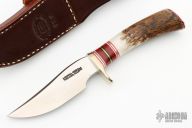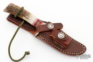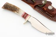 The miniature Model 27 debuted in Randall's 2012 75th anniversary catalog and is the first catalog miniature model. This knife has a satin finished stainless steel blade, .161" blade stock and 1.038" blade depth, hidden tang construction. The handle has a nickel silver guard and butt plate, and a stag handle with red, aluminum, white, red linen micarta, black and brass spacers. Comes with a brown leather sheath with miniature stone. Excellent condition.