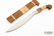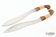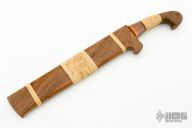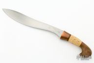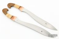 This Khu Golok by Paul Cooper features a hand forged blades that fit together with a pin in one of the blades, when they are together they look like one knife, .330" blade stock and 1.506" blade depth when the blades are together, the blades are .165" thick individually, hidden tang construction. The handles have copper guards with canary wood and rattan wrapped grips. Rattan done by Jeremy Shaw. The sheath is made from mesquite wood and rattan. New from maker! Super cool!