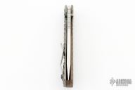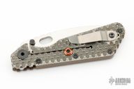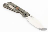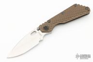 This SMF DGG by Strider has a stonewash spear point blade with dual thumbstuds, thumbhole, and a notched thumbrest. Handle is brown G-10 and bead blasted titanium "Gunner Grip", lockbar stabilizer, and titanium tip up clip. Nice detent, lockup and blade seating. Has some light scratches, has been resharpened, otherwise excellent condition.