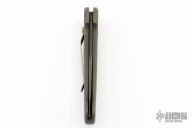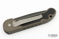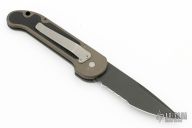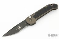 This LUDT side opening automatic by Microtech Knives has a black finished partially serrated blade. The handle has a dark bronze anodized aluminum frame with rubber inserts, with tip down stainless steel clip. Dated 3/97, S/N 214. Has scuffs and scratches, good condition otherwise.