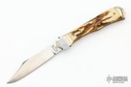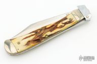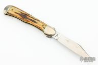 This Lever Auto by Aerial AC Mfg Co features a satin finished clip point blade. The handle has nickel silver bolsters, front and rear, stag scales, brass liners, stainless steel backspacer. Strong action, nice lockup. Has some scratches, otherwise good condition for its age. This knife is a 1970's version and is 1 of approximately 600.