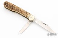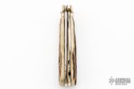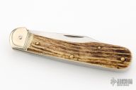 This knife by Hubertus is unique, it features two satin finished blades. The larger blade is an auto and is fired by pressing down on the back of the small blade. The handle has nickel silver bolsters, stag scales, brass liners and steel springs. Has some light scratches, otherwise excellent condition.