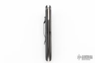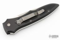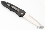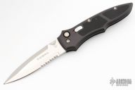 This Cobra side-opening automatic by Paragon Cutlery features a mirror polished blade with swedge and serrations. Coil spring. Sliding safety. Black aluminum handle with rubber inserts, tip down black stainless steel clip. Comes with original box. Excellent condition.