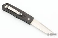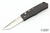 This Corby Tanto Auto by Al Mar Knives has a tumbled and polished drop point tanto blade with false top edge. Handle is black anodized aluminum with safety auto button, milled ribs, stainless steel tip up clip, and lanyard hole. Comes with original box. Has some light scuffs, otherwise excellent condition.