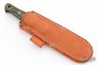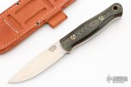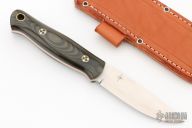 This fixed blade from Bark River Knives features a satin finish drop point blade with a scandi grind, .162" blade stock and 1.219" blade depth. The handle has black/green linen micarta scales with orange liners and mosaic pins over full tang construction. Lanyard hole on pommel. Includes leather sheath and original box. Excellent condition.