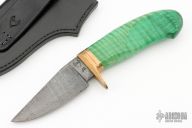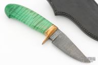 This knife by Journeyman Smith Jarrett T. Cieslak features a Damascus blade with .183" blade stock and 1.354" blade depth, hidden tang construction. The handle has a pinched and fluted silicone bronze guard, nicely figured dyed and stabilized curly maple grip. Comes with a black leather sheath and original box. New from maker!