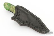 This knife by Journeyman Smith Jarrett T. Cieslak features a Damascus blade with .156" blade stock and 1.153" blade depth, hidden tang construction. The handle has a pinched and fluted stainless steel guard, nicely figured dyed and stabilized maple burl wood grip. Comes with a black leather sheath and original box. New from maker!