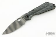 This Mick Strider SNG framelock folder features a tiger striped blade with thumbhole and notched thumbrest. The handle has a black/gray G-10 and flamed titanium frame with titanium clip, tip up carry. Jimping on blade spine. The G-10 has a diagonal groove pattern. Nice lockup, detent, and blade seating. Excellent condition. Comes with a velcro case.