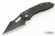 This Stitch Auto by Microtech Knives features a black fully serrated blade (well, at least it was, it has been shapened past the serrations) and false top edge, notched thumb and finger rests. The handle has a black anodized and milled aluminum handle with a DLC titanium backspacer, DLC stainless steel hardware and clip, tip up carry, lanyard hole at the butt. S/N 2672 and dated 08/2017. Has been poorly resharpened, has scuffs and scratches, poor condition.