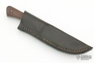 This knife by Brian Goode features a satin finished blade with .094" blade stock and .683" blade depth. The handle has green canvas micarta scales over black liners and full tang construction. Includes black leather sheath, not original, but it fits. Has some scratches and pitting on the blade, otherwise good user condition.