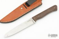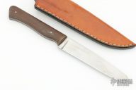 This knife by Brian Goode features a satin finished blade with .096" blade stock and .995" blade depth. The handle has green canvas micarta scales over full tang construction. Includes brown leather sheath, not original, but it fits. Has some scrathces and pitting on the blade, otherwise good user condition.