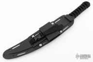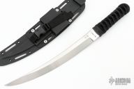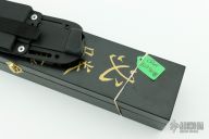 The Hisshou from CRKT features an upswept two tone blade with polished flats and hand rub satin grinds. The handle is comprised of Japanese style wrap over black leather and hidden tang construction. Includes kydex sheath with belt loop and wood presentation box. Has some light scratches, otherwise excellent condition.