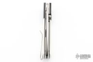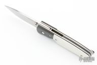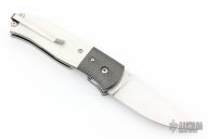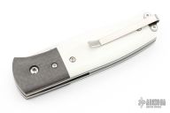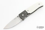 This knife by Tobin Smith features a hand rub satin finished blade with single thumbstud. The handle has carbon fiber bolsters, white G-10 scales over black G-10 liners, titanium liners and a matching tip up clip, three-piece backspacer. Nice detent, lockup and blade seating. Comes with COA dated April 2014 and original box. Has scratches, otherwise good condition.