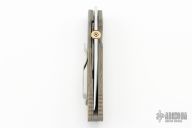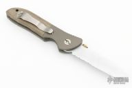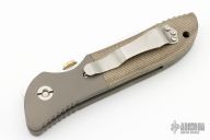 This PoBoy Emerson Raven features a silver chisel ground tanto partially serrated blade with a custom brass thumbdisc. The handle has bead blasted and dovetailed titanium bolsters, green canvas micarta scales, bead blasted titanium liners, tip up stainless steel clip. Comes with original box and papers. Excellent Condition. Dated 2001