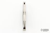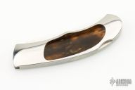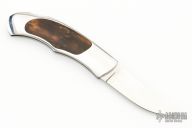 This knife features a mirror polished clip point blade. The handle has a mirror polished stainless steel frame with mastodon inlays. Blade is centered when closed and locks up with no play. Excellent condition.