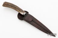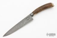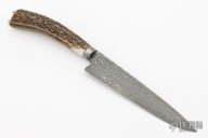 This Gaucho from Ricardo Perpina features a Damascus blade with a false top edge and fileworked spin, hidden tang, .212" blade stock and 1.236" blade depth.  The handle has an integral Damascus guard and a nickel silver butt, stag grip. Comes with a black/brown leather sheath. New from maker.