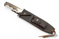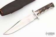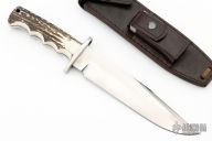 This Randall Style Model 14 Fighter from Ricardo Perpina features a satin finish clip point blade with a sharpened top edge and a full tang, .234" blade stock and 1.597" blade depth.  The handle has a stainless steel guard with stag scales. Comes with a black leather sheath with sharpening stone. New from maker.