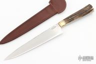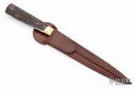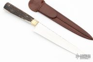 This Gaucho from Ricardo Perpina features a satin finished blade with fileworked spine and a full tang, .095" blade stock and 1.459" blade depth.  The handle has fluted brass bolsters and stag scales. Comes with a brown leather sheath. New from maker.