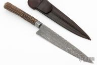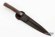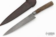 This Gaucho from Ricardo Perpina features a Damascus blade with a false top edge and fileworked spin, hidden tang, .221" blade stock and 1.435" blade depth.  The handle has an integral Damascus guard and a nickel silver butt, stag grip. Comes with a black leather sheath. New from maker.