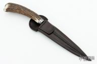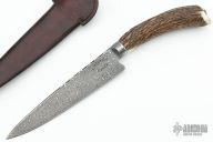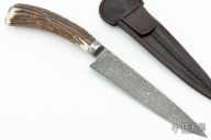 This Gaucho from Ricardo Perpina features a Damascus blade with a false top edge and fileworked spin, hidden tang, .178" blade stock and 1.215" blade depth.  The handle has an integral Damascus guard and a nickel silver butt, stag grip. Comes with a black leather sheath. New from maker.