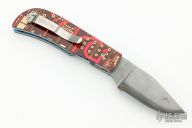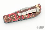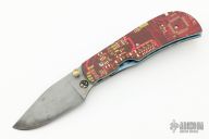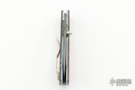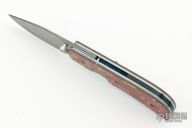 This linerlock by Jake Elenbaas features a Japanese Blue Steel San Mai blade with single thumbstud. The handle has mother board scales with white G-10 liners, anodized titanium liners and a black G-10 backspace, tip up stainless steel clip. Comes with COA. New from maker.