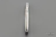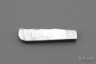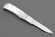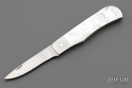This slipjoint by Ralph Turnbull features a hand rub satin finished blade with nail nick. The handle has stainless steel bolsters with integral liners and mother of pearl inlays. Has half-stop. Has some scratches, otherwise good condition.