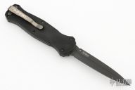 "Introducing an OTF like none-other.. The new Infidel® is rapidly making believers out of many a skeptic. Built for strength and reliability the patent pending double-action mechanics get it done over the long haul. Grab on and you will find the handle grip rock-solid with its patented machined in Presidio® style bi-directional tread pattern, and overall generous sizing for gloved hands. Intuitively pressure the release-slide forward and its spear-point edged steel fires and locks up with a unique three-point retention system with amazingly negligible blade play. Reverse the process and the blade retracts in a rapid blur of motion. The Benchmade Infidel is a special operator’s fantasy come true." Includes original sheath and papers. Excellent condition.