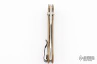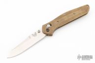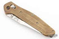 This 940-2 Osborne Axis Lock Folder from Benchmade has a satin S30V clip point blade with false top edge and dual thumbstuds. Handle has stonewashed brass scales, comes with original black G-10 scales, stainless steel internal liners, anodized aluminum barrel spacers, and black finished stainless steel tip up clip (RH/LH Reversible). Dead center blade seating and excellent lockup. Comes with original box and papers. Excellent condition.