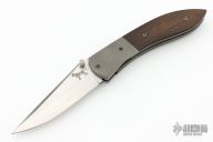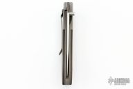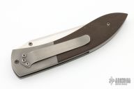 This linerlock folder by John Etzler features a satin finished clip point blade with a single checkered thumbstud and notched thumbramp. The handle has blasted titanium bolsters, linen micarta scales, bead blast titanium liners and stainless steel clip, tip down carry. Nice blade seating, detent and lockup. Has some scuffs, otherwise good condition.