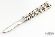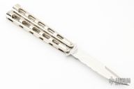 This Model 239S balisong by Benchmade features a tumble polished partially serrated blade with false top edge. The Zanak handle has polished finish and latch. Has some light scratches, otherwise excellent condition.