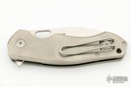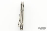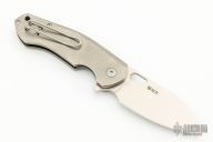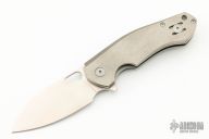 This AICE BIBLIO by Giant Mouse features a satin finished drop point blade with thumb hole and notched thumb rest. The handle is comprised of a tumbled titanium frame with a stainless tip up pocket clip. Excellent condition. Comes with original box.