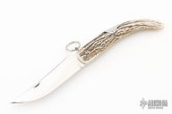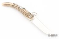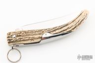 This Yatagan Ring Folder by Jaques Mongin features a mirror polished blade with nail nick. The handle is a single piece of stag with a mirror polished stainless steel ring pull lock. Excellent condition. Comes with a zippered case.