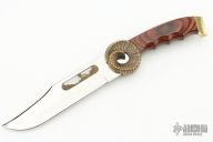 This Big Horn Sheep Bowie by Kershaw is #2929 of 5000. It features a mirror polished clip point blade, .168" blade stock and 1.558" blade depth, hidden tang construction. The handle has a bronze cast guard, brass butt, and dymondwood grip. Comes with a wooden display box. There is a little rattle in the guard, otherwise excellent condition.