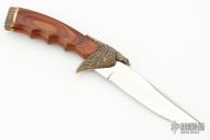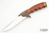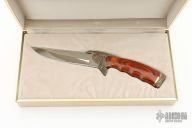 This Bald Eagle Bowie by Kershaw is #2924 of 5000. It features a mirror polished clip point blade, .164" blade stock and 1.100" blade depth, hidden tang construction. The handle has a bronze cast guard, brass butt, and dymondwood grip. Comes with a wooden display box. Excellent condition.