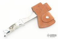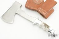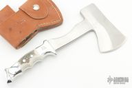 This 22H - Hatchet from Ruana knives features a satin finished head  with hammer pole, of .326" blade stock and 2.75" blade depth, hidden tang construction. The handle is cast aluminum with elk antler inserts. Comes with original brown leather sheath. Has some light oxidation on the blade, otherwise excellent condition.