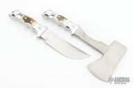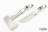 This 22H - Hatchet from Ruana knives features a satin finished head  with hammer pole, of .348" blade stock and 2.75" blade depth, hidden tang construction. The handle is cast aluminum with elk antler inserts. Has some light scratches, otherwise excellent condition.