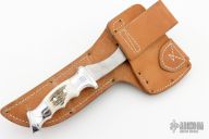 This 20B Knife from Ruana knives features a satin finished head  with notched thumbrest of .175" blade stock and 1.553" blade depth, hidden tang construction. The handle is cast aluminum with elk antler inserts. Has some light scratches, otherwise excellent condition.