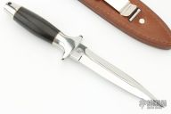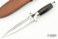 This Trooper by Kershaw Knives is a mirror polished double-edged dagger with fullers, .215" blade stock and .937" blade depth, hidden tang construction. The handle has a stainless steel guard and butt with wood grip and brass spacers, lanyard hole at the butt. Comes with a brown  leather sheath, original box and papers dated February 1991 and S/N 19090.  Excellent Condition.