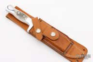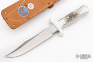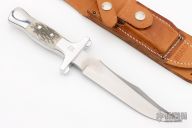 This SOG Style Fighter by Ruana Knives features a satin finished blade with a sharpened top edge, .242" blade stock and 1.196" blade depth, hidden tang construction. The handle is cast from aluminum with elk inserts. Comes with brown leather sheath. Excellent Condition.