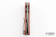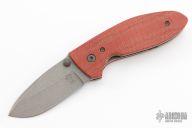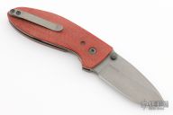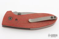 This Alpha by Tom Krein features an acid finished drop point blade with dual thumbstuds and a false top edge. The handle has Chili Pepper Canvas Micarta scales, tumbled titanium liners and tip up clip, titanium backspacer. Nice lock up, detent and blade seating. Includes a padded case and COA. Excellent condition.