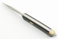 This Mini Solitude TL by Jared Oeser features a hand rub satin finished blade with nail nick. The handle has black westy linen covers, over ivory and black liners, and a stainless steel spring. Nice lockup and blade seating. Comes with original box (a little beat up), leather slip sheath, hank, and COA dated 3-27-21. Excellent condition.