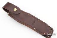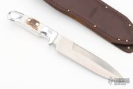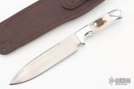 This Combat Knife by Ruana knives features a satin finished double edged blade with notched thumbrest, .164" blade stock and 1.362" blade depth, hidden tang construction. The handle is cast from aluminum with elk horn inserts. Comes with a brown leather sheath and a zippered case.  Excellent condition.