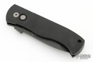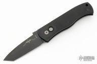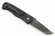 This Emerson/Pro-Tech CQC7 automatic has a chisel ground black DLC finished blade with a plain edge and a solid black aluminum handle. Black stainless steel clip. Coil spring. New from Maker!