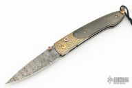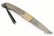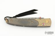 The B10 "Scepter" by William Henry features a Noris"Ladder" Damascus blade with single thumbstud with ruby inset in gold bezel. The frame is Koftgari inlaid 24k gold with carbon fiber scales, 24k gold-coated stainless/titanium fittings. Sterling silver lanyard bail. Includes, leather clipcase, original box and all paperwork dated Feb 22, 2006. Excellent condition.