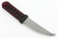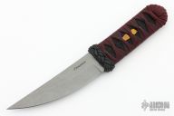 This Aikuchi from Ben Tendick of B.R.T. Bladeworks features a tumbled finished kwaiken style blade with swedges. .186" Blade stock 1.260" Blade Depth. The handle has a Tsuka Ito wrap over an epoxy soaked hemp cord underwrap and a hammered titanium menuki. Includes kydex sheath and COA dated 8-3-23. New from Maker!