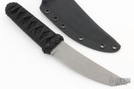 This Kraiken from Ben Tendick of B.R.T. Bladeworks features a kwaiken blade with swedges. .185" Blade stock 1.218" Blade Depth. The handle has a Tsuka Ito wrap over hemp cord underwrap and a titanium menuki.  Includes kydex sheath and a C.O.A. Brand New from Maker.