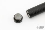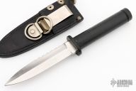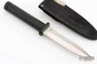 This Survival Boot Dagger by Dan Thornton features a satin finished double edge blade with one partially serrated edge, hidden/hollow tang construction, .174" blade stock and .997" blade depth. The handle has a stainless steel guard, knurled aluminum handle and a removeable aluminum butt cap. Butt cap is stamped "Thornton" Comes with a black leather sheath. Has some scratches, otherwise good condition.