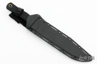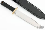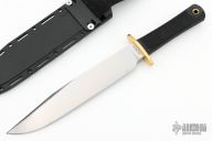 This Trail Master bowie by Cold Steel features a satin finished clip point blade with a false top edge, .301" blade stock and 1.609" blade depth, hidden tang construction. The handle has a brass guard and a rubber handle. Has a couple light scratches, otherwise excellent condition. Includes a kydex sheath and the original box.