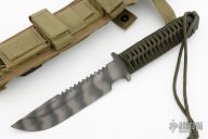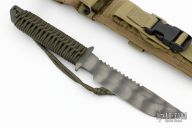 This MT Fixed Blade from Strider Knives features a tiger striped spear point blade with notched thumbrest and serrated top edge, .253" blade stock and 1.289" blade depth. The handle has paracord wrap over full tang construction with a lanyard hole. Includes nylon sheath with belt loop. Excellent condition.