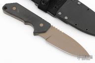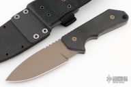 This Buck/Strider collaboration features a green coated drop point blade with notched thumbrest, .180" blade stock and 1.696" blade depth, full tang construction. The handle has textured black G-10 scales with a lanyard hole. Comes with a custom kydex sheath. Has a couple light scratches, othewise excellent condition. Rare.